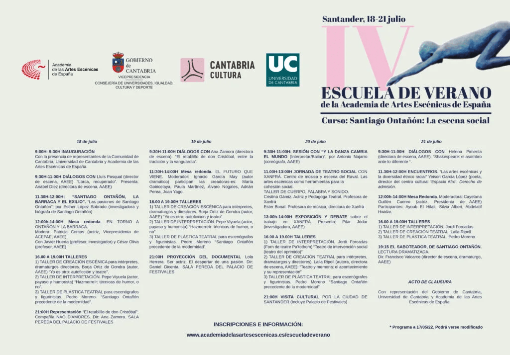 Un año más, la Academia de las Artes Escénicas de España plantea una actividad en su Escuela de Verano. Por cuarta vez, se produce la colaboración entre varias instituciones públicas para ofrecer un programa que une rigor, excelencia y entretenimiento, para que jóvenes de diversas comunidades participen en un proyecto de formación. Este año, Cantabria es la referencia ideal para, a partir de una personalidad tan destacada del mundo de la escena como Santiago Ontañón, considerar, junto a su condición de artista plástico de primer nivel, la actualidad de la escena social en sus formas más destacadas. Las actividades se desarrollarán entre el Palacio de Festivales de Cantabria y la Filmoteca Mario Camus. Nombres como los de Cayetana Guillén Cuervo, Pepe Viyuela, Laila Ripoll, Lluis Pascual, Ana Zamora, Lluis Pascual, César Oliva, Antonio Najarro, Borja Ortiz de Gondra, Helena Pimenta, Ana Zamora, Ignacio García May y Javier Huerta -que también impartirá un curso este verano en la UIMP– entre otros nombres. Eduardo Vasco será el director de este curso que contará con 50 horas lectivas. Del 18 al 21 de julio Santander se convertirá por primera vez en uno de los centros estratégicos de las artes escénicas de toda España.