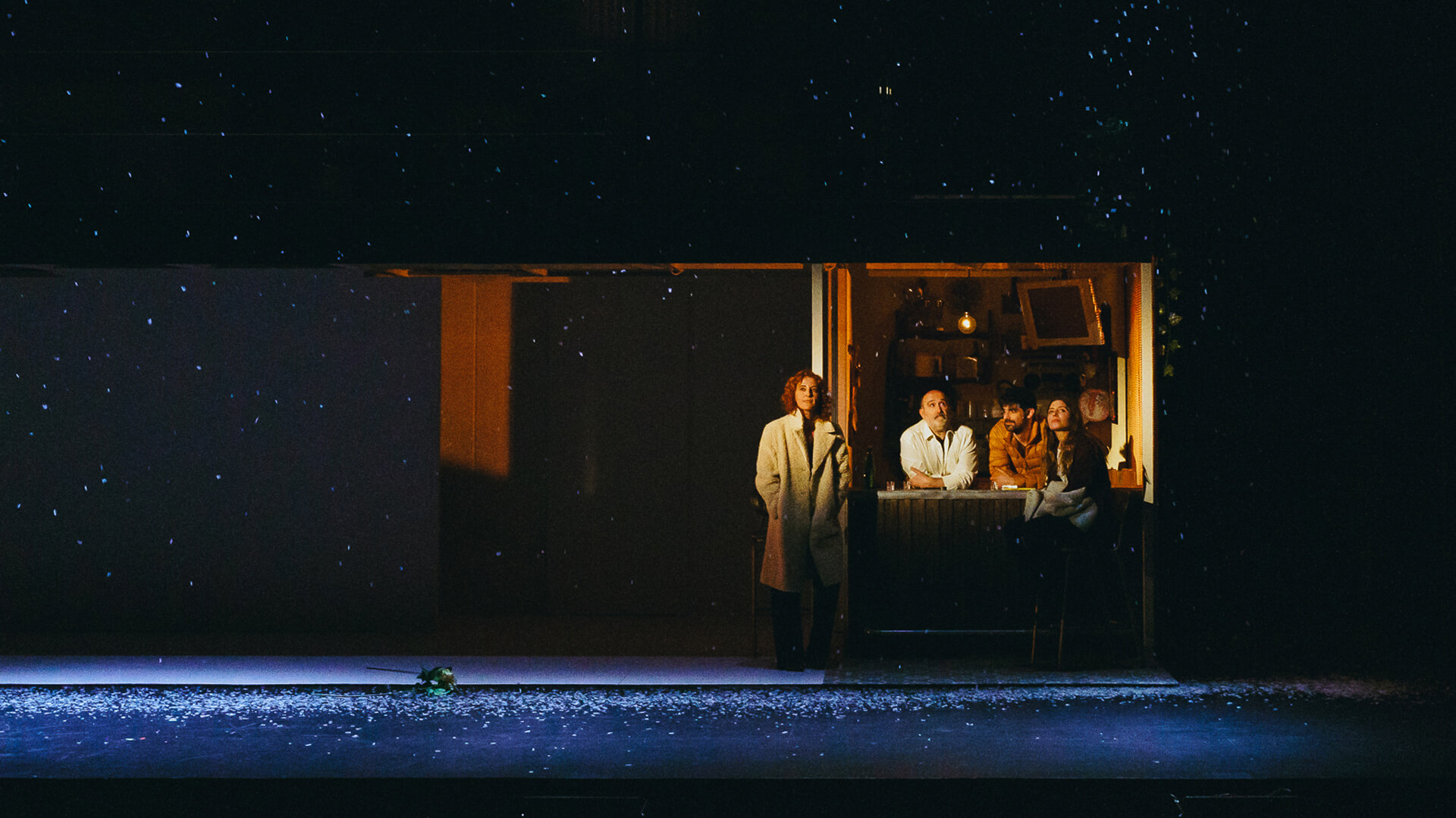 Ellos y ellas, Javier Cámara, Francesco Carril, Bárbara Lennie y Nuria Mencía en mil y un personajes, en teatro haciendo cine, en directo, pero también en diferido cuando nos cuentan su pasado, en compañía mientras están en soledad, en acercamiento mientras están lejos.