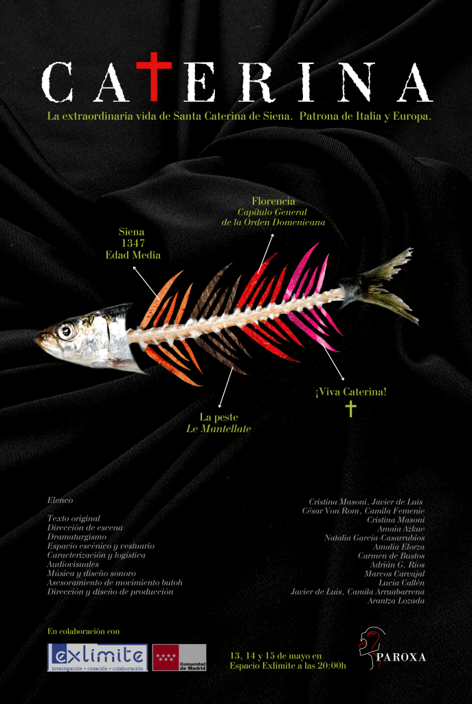 Hoy veo una historia de una santa. Caterina de Siena, patrona de Italia y de Europa. Doctora de la iglesia, con la que topamos aún todavía, redundando. Mística de la Edad Media, como bien recalcan en este montaje de la compañía Paroxa. Sin embargo, damos, dan, un salto al futuro nuestro, en el que estamos, y después de vilipendios, juicios, 23 hijos de su madre, la peste negra, y una paloma en la cabeza, estos desalmados, en el término cariñoso del adjetivo, nos llevan a la inmediatez de sus hechos. A lo que dejó, legó, y tuvo que luchar contra el infierno, que no es otro que el de la sociedad en la que vivió y nosotros seguimos viviendo.